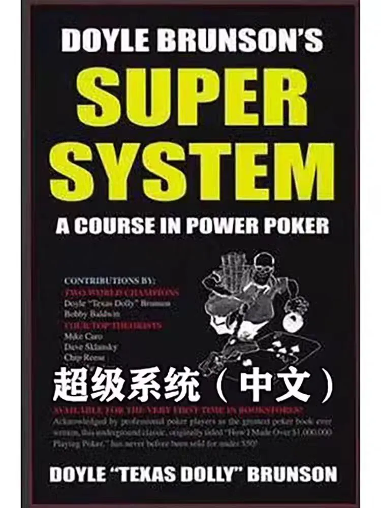《超级系统》英文名为《Super System》,作者是Doyle Brunson,2002年出版了第一册。在《超级系统1》征服世界后,2009年,Brunson携手Bobby Baldwin, Mike Caro, David Sklansky, Chip Reese和Joey Hawthorne众多殿堂级顶尖扑克巨擘推出《超级系统2》,这系列书籍其价值与美誉度在整个扑克世界不敢屈居第二。被誉为是“扑克圣经”。 作者在1976年和1977年连续2年获得了WSOP主赛事的金手链,这2次比赛的最终决赛桌的最终对决中,连续2年用T-2这手牌击败对手获得冠军,甚至人们用他的名字来命名T-2这手牌。1979年时还很少有人了解扑克策略,但二次WSOP冠军得主Doyle Brunson用他划时代的奇书《超级系统》改变了这一切。 他以凶狠的攻击打法而闻名,他具备强烈的荣誉感。对于如何在无上限投注德州扑克中获胜,Brunson提供了三条基本法则:凶,凶,更凶。Brunson崇尚无情战术,声称如果运用得当,将称雄牌桌。后来他自己承认,这本书给他带来了数百万的损失,因为玩家们已经熟悉了他的风格。